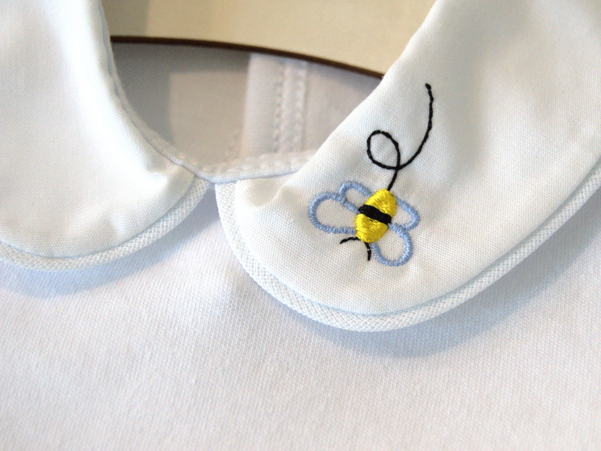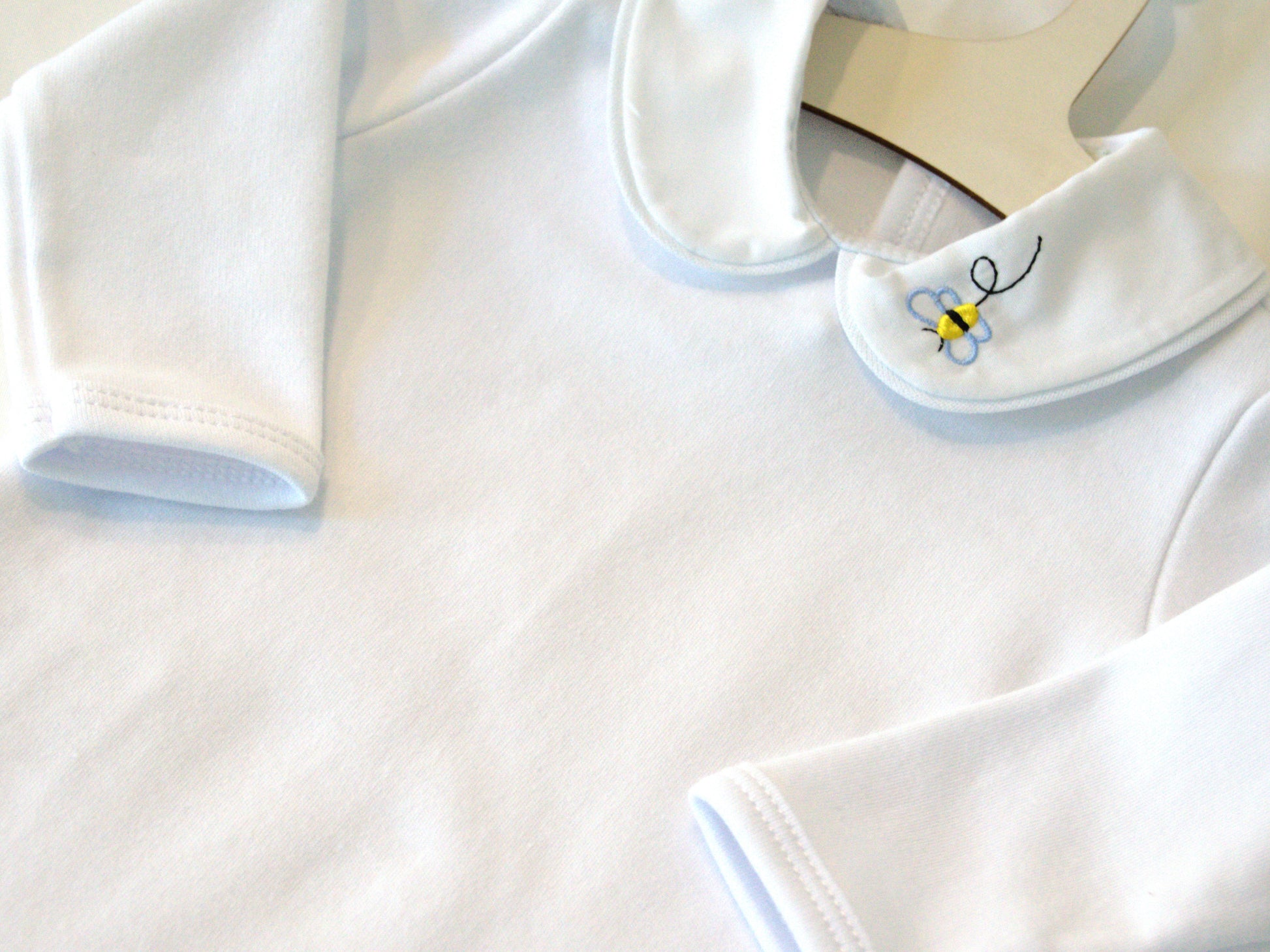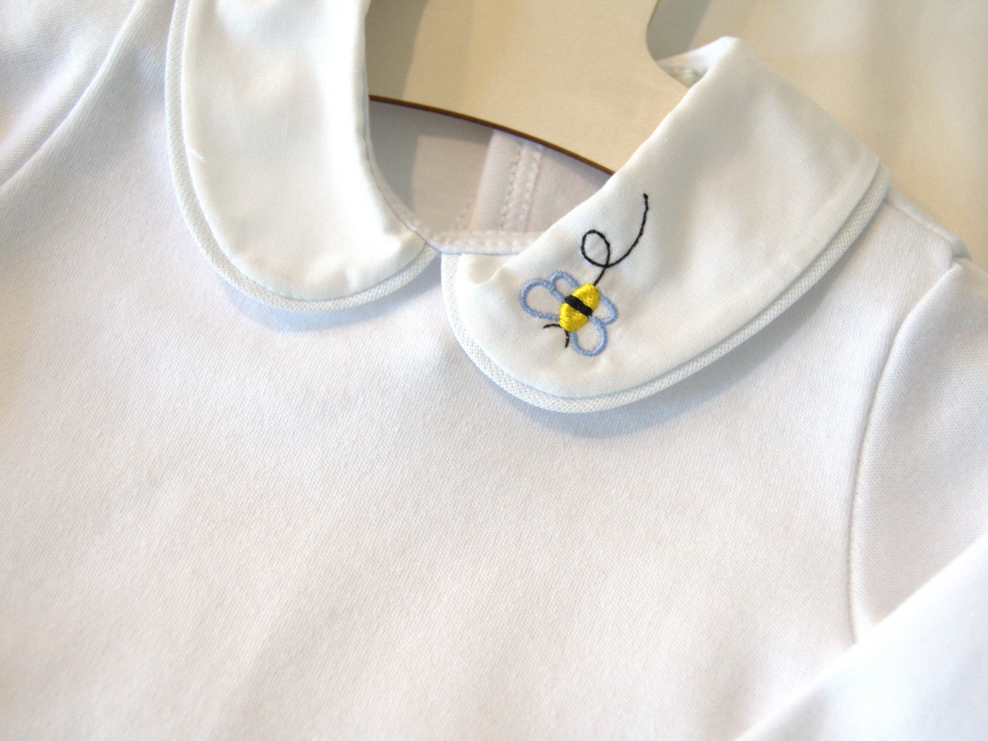 This adorable long-sleeve bodysuit features a charming bee embroidery delicately placed on the collar, adding a sweet touch of whimsy to your little one's wardrobe. Crafted from 100% Egyptian cotton, this bodysuit offers exceptional softness and breathability for your baby's delicate skin, while ensuring durability through countless washes.