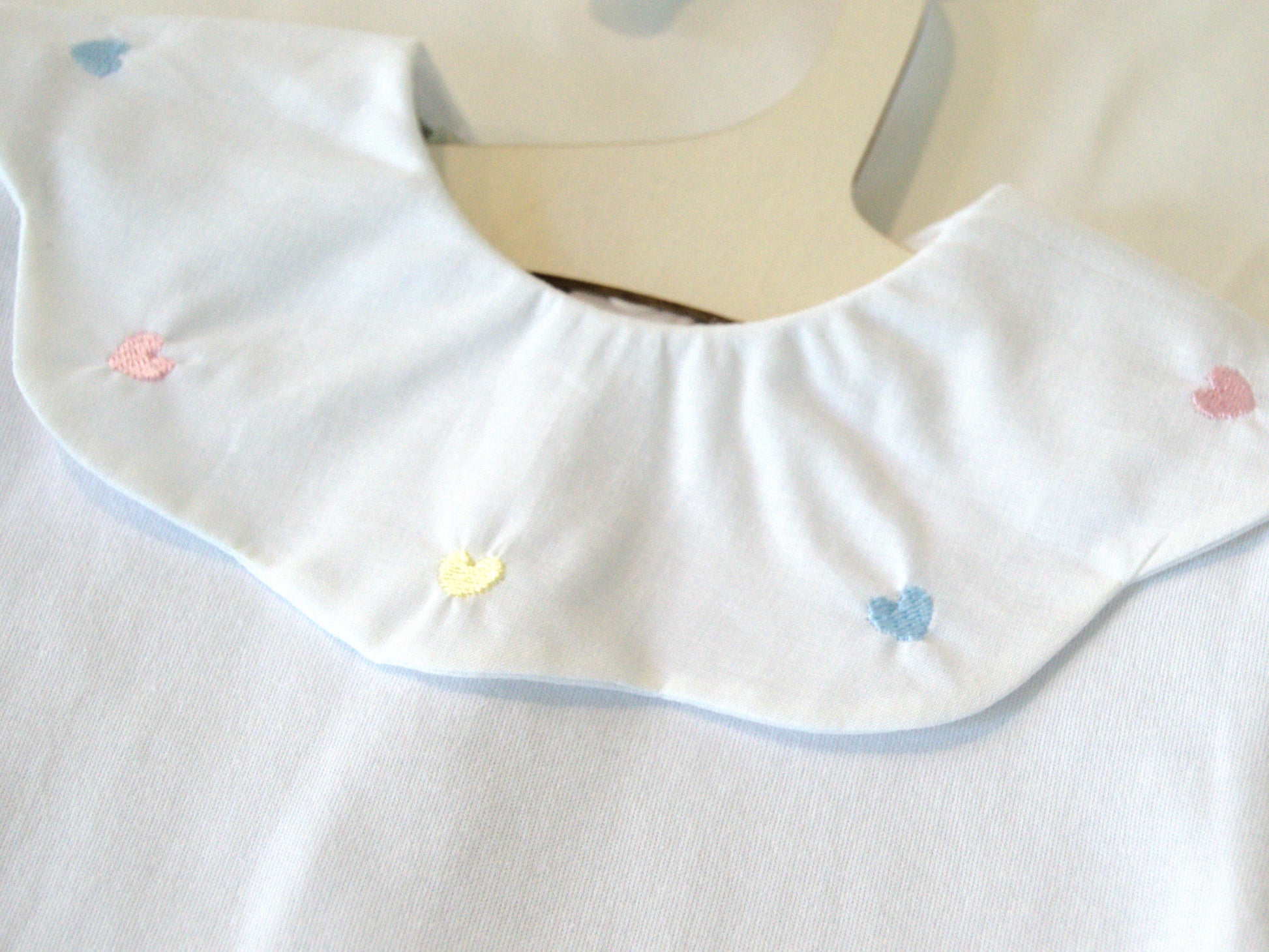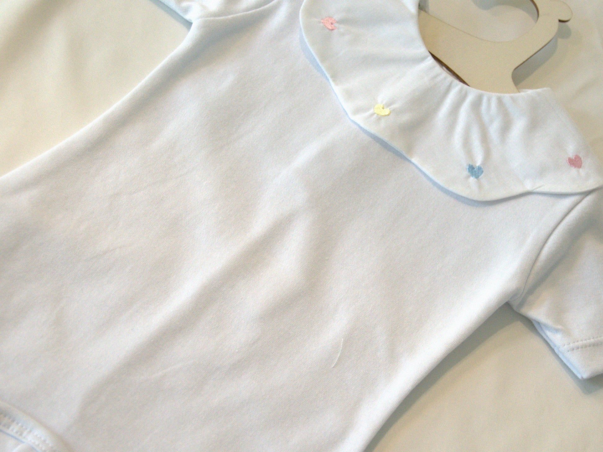 This delightful short sleeve bodysuit features charming embroidered hearts scattered across the fabric in soft pastel colors, creating a sweet and playful design perfect for your little one. Crafted from 100% Egyptian cotton, this bodysuit provides exceptional softness, breathability, and gentle comfort against your baby's delicate skin while maintaining long-lasting quality through frequent washing.